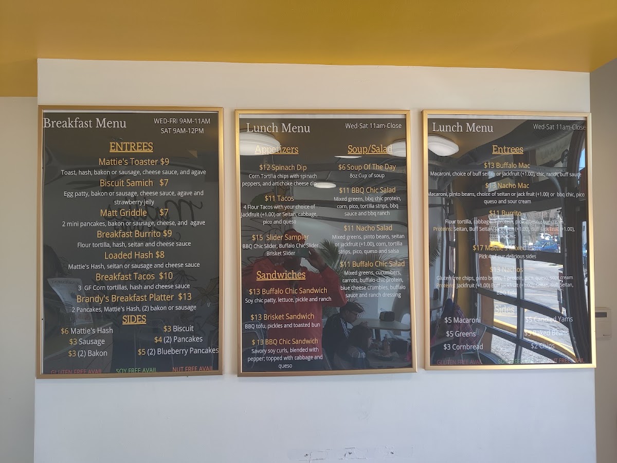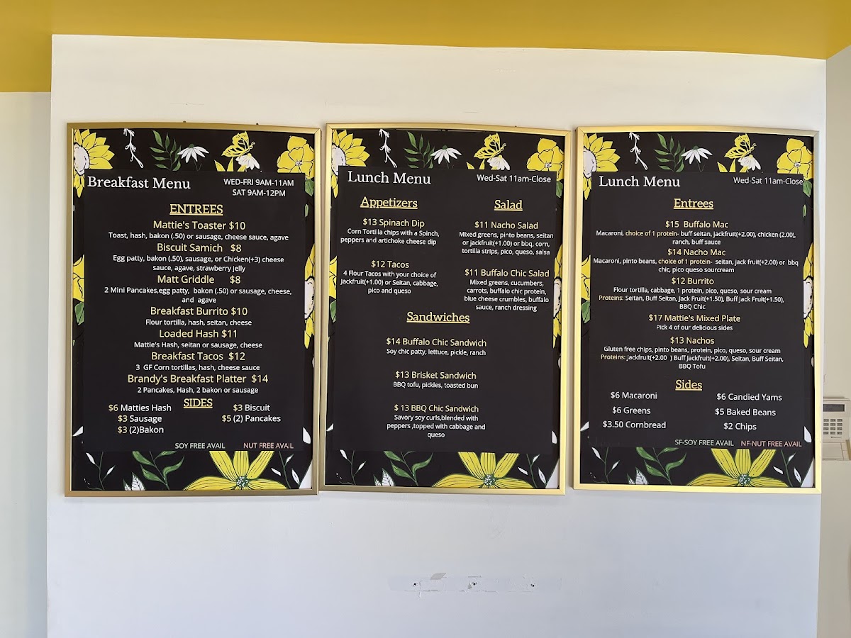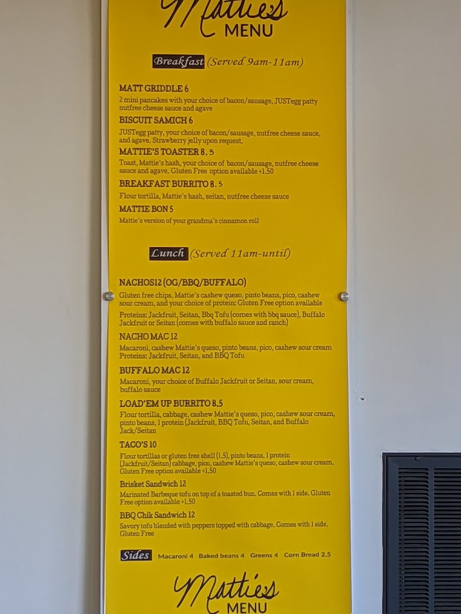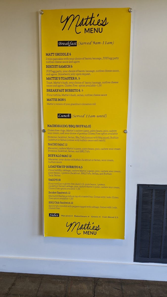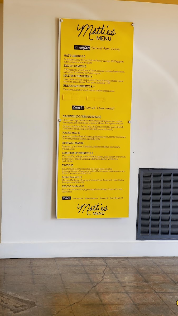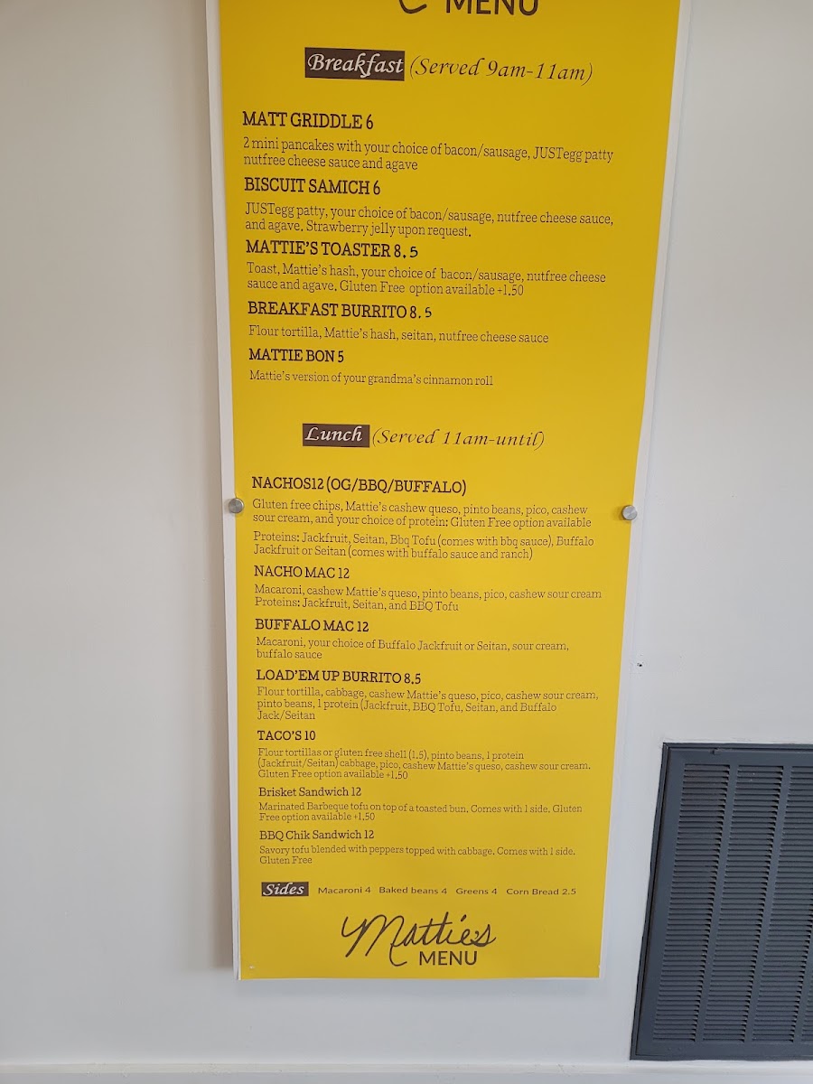 For sides, you can enjoy Mama Lisa's Greens, Queso, or Candied Yams to complement your meal. And if you have kids in tow, there are family-friendly options like the 2 Chicken Tenders + Side and Grilled Cheese + Side. Whether you're looking for a quick snack or a full meal, Mattie's Foods ensures there's something for everyone to enjoy.