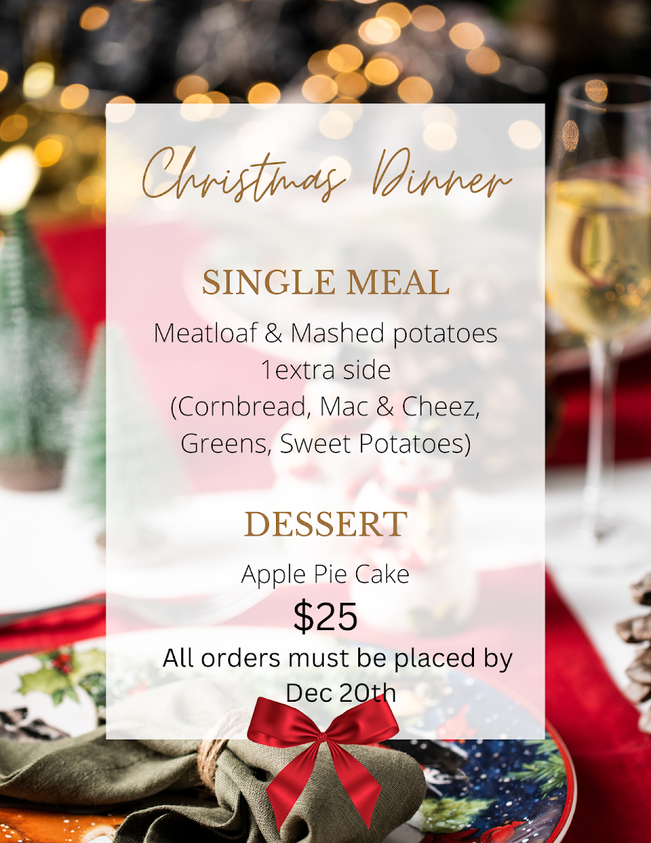Featuring a combination of macaroni and cheese, collard greens, yams, freshly baked cornbread with a side of meatloaf in one bowl. No substitutions.